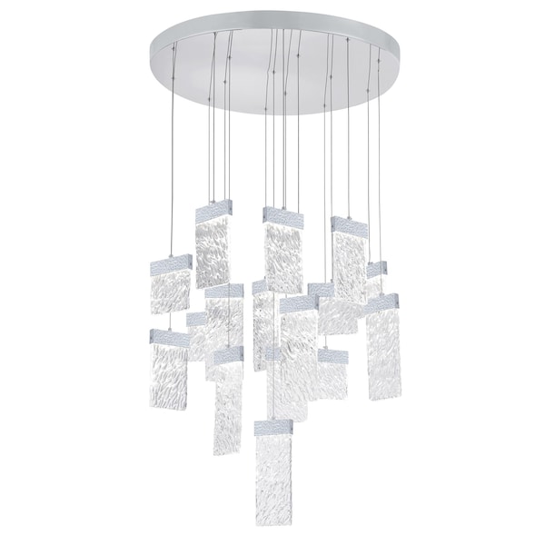Edgy but with a soft and feminine essence, the Carolina Pewter 32 inch LED Chandelier is ready to give your home an elegant finish without making your interiors look and feel stuffy. This modern down chandelier features a round canopy holding 16 textured clear glass panels with integrated LED chips. This light source easily adds contrast, layer, texture, and style to wherever it is placed.