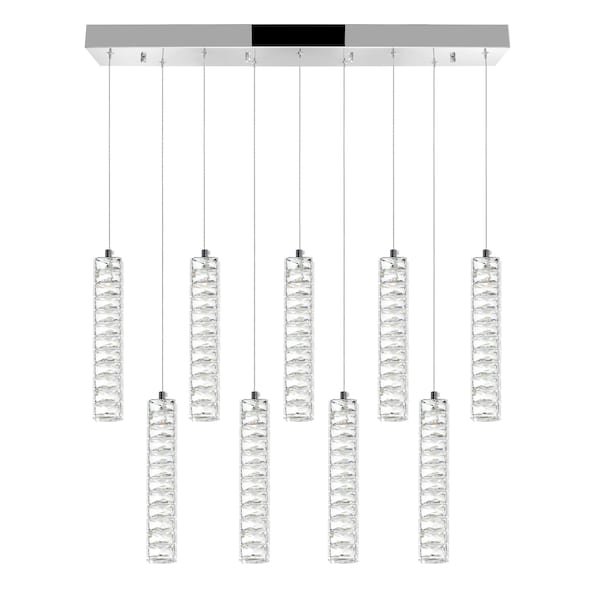 The 31 inch Celina 9 Pendant LED Chandelier can serve as a functional art piece in your living room or dining room. This pool table/island light is designed with a rectangular canopy in chrome holding glittering bars of light. This is an oversized chandelier that will provide your space with energy-efficient illumination and an effortless style transformation. Cords are adjustable.
