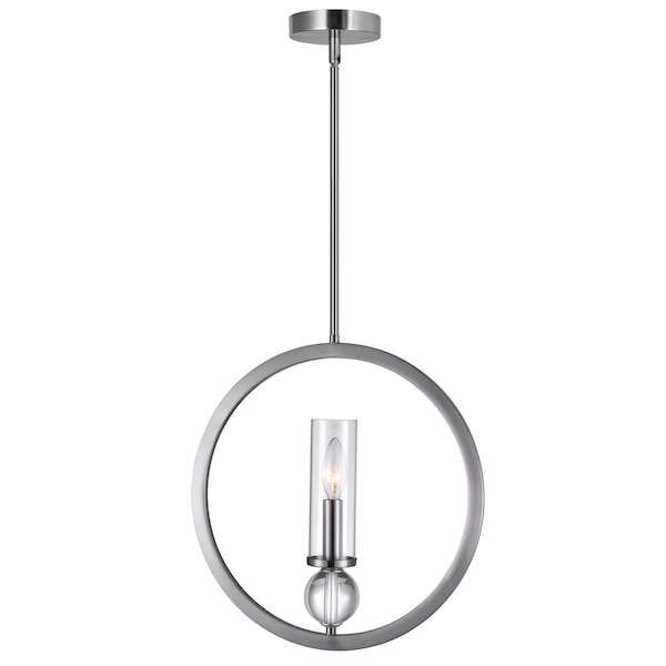 Give character to your minimalist space through this Elton 1 Light Chandelier. Styled with a clean design, this single-bulb pendant light features a 15 inch ring holding one candelabra bulb inside a cylindrical glass shade. The satin nickel finish exhibits that retro-streamlined look that will complement the vintage-y decor in a modern rustic space.