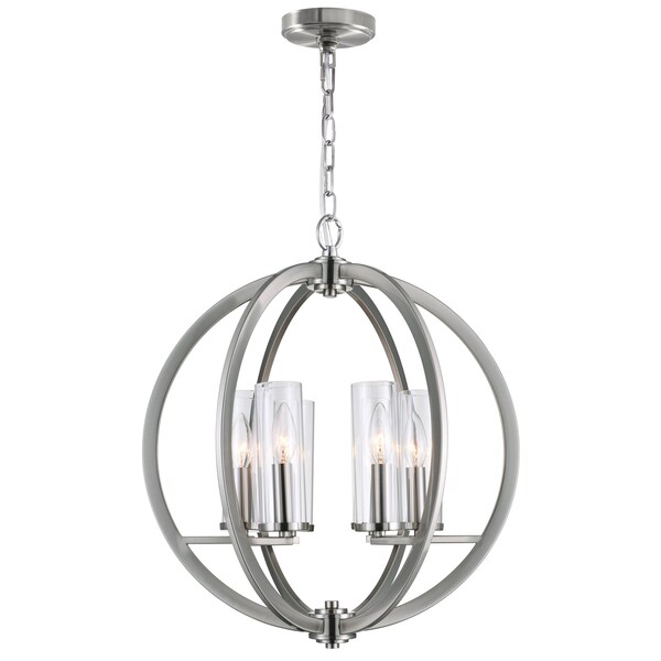 Its style is a pared-back take on that trendy orbital chandelier.The Elton 6 Light Chandelier will impress you with its unassuming beauty. Held by an adjustable chain is an orbit-like pendant in satin nickel finish. Sitting inside are six candelabra bulbs on cylindrical glass shades. This 19 inch orbit chandelier will fit rustic-upscale or modern rustic interiors.