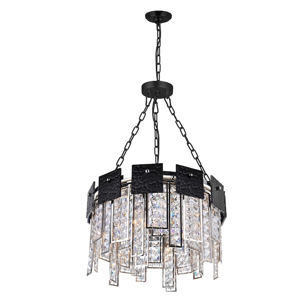 Install the Glacier 6 Light Chandelier and watch your room come to life. This elegant chandelier measures 16 inches in diameter and is designed with a combination of textured black metal panels and shimmering clear glass crystal panels. It has the glitzy factor without going too over-the-top making it the perfect fixture to glam up a simple living room or dining room.