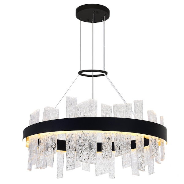 Give your dining room a modern glam glow with the Guadiana 32 inch Round Black LED Chandelier. This light source is designed with a black metal band embellished with narrow panels of clear textured glass. The overall look is simple yet luxurious which is perfect when you want to give your modern interiors a little sprucing up while still maintaining that air of minimalism.
