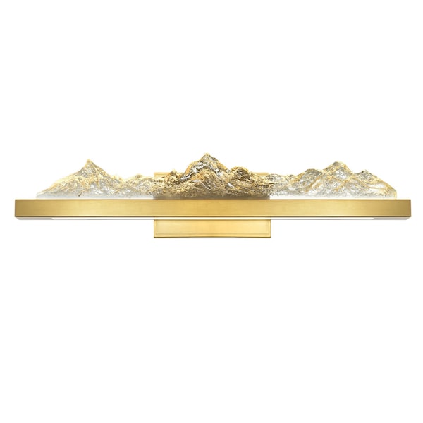 Experience the grandeur of the Himalayas Integrated LED Vanity Light. A stunning lighting fixture that channels the serene beauty of the mountains into your bathroom. Impeccably crafted with intricate detail, this chandelier captures the essence of the Himalayan landscape, bringing a touch of natural inspiration to your space in a beautiful brass finish. The cascading LED light emulate the tranquil flow of mountain streams, creating a harmonious and inviting ambiance.