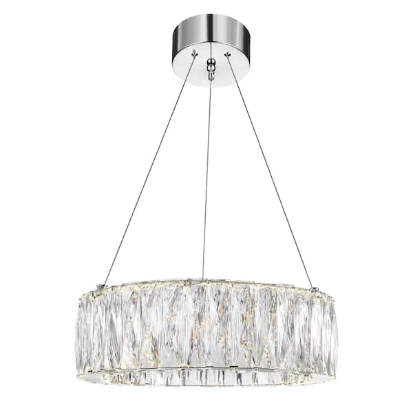 Bringing vibrant sparkle to your space is the Juno 5 LED Chandelier. This streamlined light fixture showcases a single halo of light, measuring 5 inches thick, covered in faceted clear crystals. The glittering ring is powered by energy-efficient LEDs that deliver brilliant illumination. Finished with chrome hardware, this modern lighting option will fill any space with an elegant air.