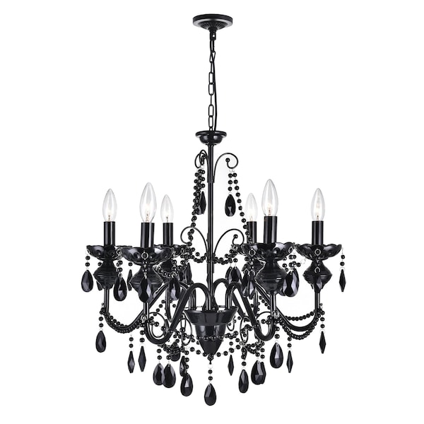 This black up chandelier has that unusual yet elegant look that will bring drama to any space. Your bland living room or uninviting dining area will benefit from this black-finished Keen 6 Light Chandelier. The candelabra frame and the draping and dangling black crystals work together to furnish any space with depth and a little bit of theatrical charm. This sophisticated light source will not simply add warmth to the space it's in but will also provide it with a distinguished allure.
