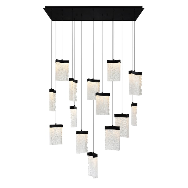 The Lava Integrated LED Chandelier is a perfect blend of contemporary design and enduring sophistication. The textured glass pieces, meticulously designed for a sleek aesthetic, adds a touch of modern charm to any space. With adjustable hanging length and beautiful black finish, this chandelier stands as a versatile and stylish addition to elevate the atmosphere of any room.