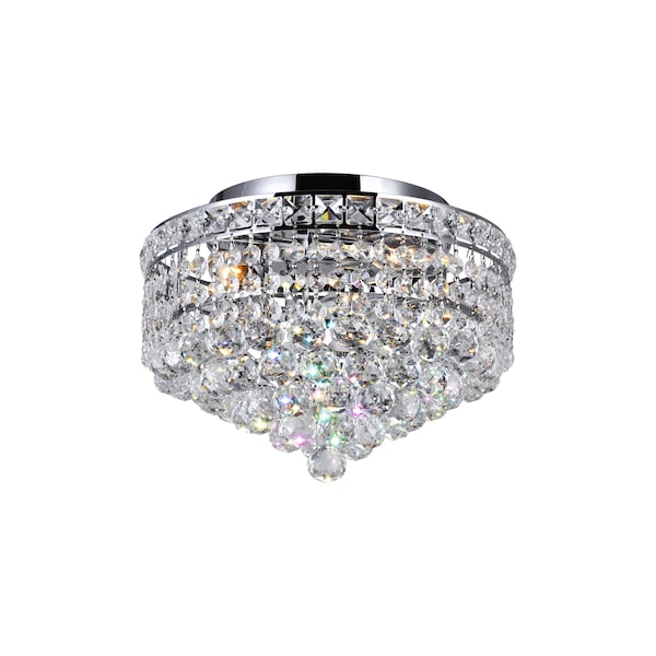 The Luminous 3 Light Flush Mount in Chrome can help elevate the style of a room at minimal cost. This 12 inch lighting features a circular base in chrome finish adorned with faceted crystals that form a shade. Hidden inside the crystal shade is a candelabra base for holding three bulbs. This light fixture will complement silver or chrome accents in a transitional, modern, or contemporary space.