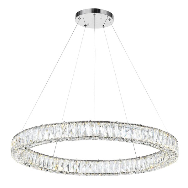 This halo chandelier is not to be missed. The Madeline 1 Ring LED Chandelier features a 3 inch thick round pendant measuring 32 inches in diameter. Its entire side is covered in faceted crystals that diffuse a brilliant but soft glow. Finished with chrome hardware, this decorative and functional fixture offers energy-efficient light and effortless elegance.