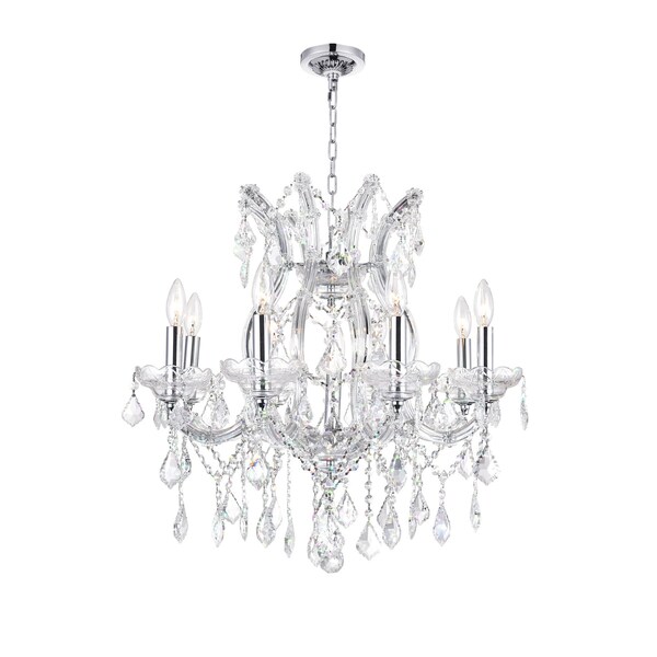 Ready to spread opulent light throughout a room is the Maria Theresa 9 Light Chandelier. Styled to look like a glammed-up candelabra, this up chandelier has chrome-finished hardware complemented by draping strands of crystals and dangling crystal accents. With a 24 inch diameter, this light fixture can add elegance to your living room, dining room, or even in the bedroom.
