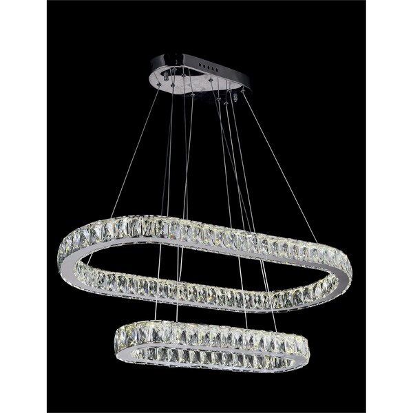 Effortlessly make a room feel luxe and larger by replacing your light fixture with the Milan 2 Tier LED Chandelier. This oversized glam light has two racetrack-shaped frames covered on its sides with faceted crystals and LEDs. Held by adjustable cords on a chrome canopy, this chandelier will look perfect over your dining table or kitchen island.