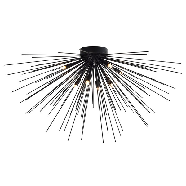 Like a ray of sunshine, the Savannah 8 Light Flush Mount Light in black Finish will lend your home a golden glow. This breathtaking luminaire designed with a starburst or Sputnik style gleams ultramodern elegance in every direction. Eight unshaded lights provide ample illumination and ensure your space gets its much-needed dose of pizzazz.