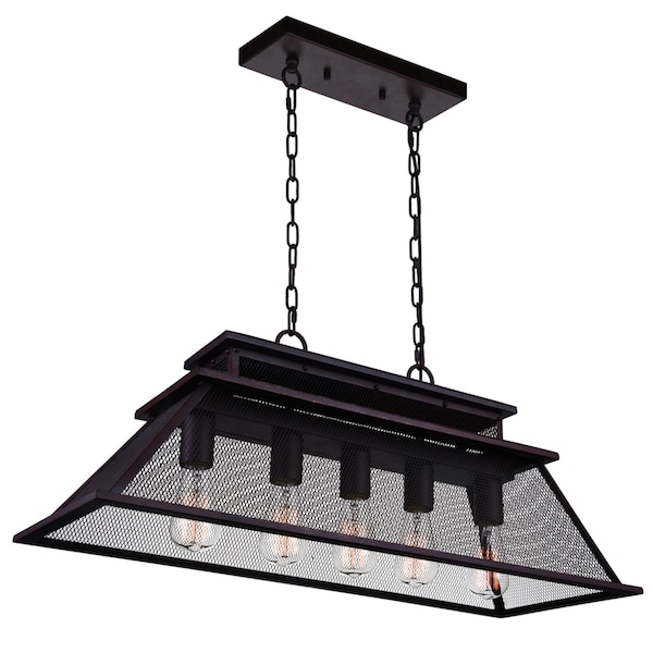 Want a dining room or kitchen that's bursting with character? Add the Savill 5 Light Chandelier and bring warmth and personality to an all-white farmhouse-style cooking area or to an urban industrial dining room. This 32 inch linear chandelier hangs from two black chains connected to a rectangular canopy. The reddish black mesh shade features a geometric silhouette that's striking and interesting. Softening the overall look are five E26 bulbs that diffuse warm illumination.