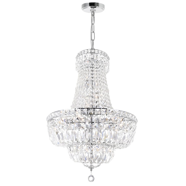 Ready to make a grand statement in any entryway is the Stefania 20 Light Chandelier. This down chandelier measures 35 inches tall and has a 31 inch diameter. With chrome hardware that complements the clear crystal embellishment, this glistening lighting will give your guests a warm and wondrous welcome.