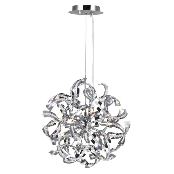 This Swivel 18 Light Chandelier is an ideal accent point in the kitchen, over a dining table, in the foyer, or the living room. Its breathtaking design features a spherical silhouette of crystal-laden metal curls. This striking light source delivers a delicate yet bold glow that will create a magical shadow on your ceiling and surroundings.