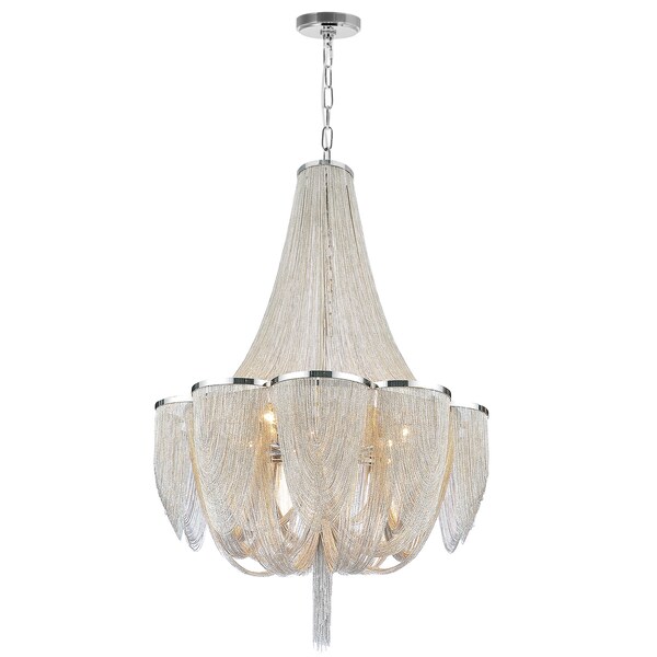 Transform your space with the luxurious appeal of Taylor 18 Light Chandelier. This elegant light fixture features veils of jewelry chains draped and flowing to form a sophisticated silhouette. A 34 inch wide flower-shaped metal frame in chrome finish acts as a central base to hold and connect the delicate chains for a cohesive yet fluid look. A statement for any room, this piece is ideal for hallways, entryways, or living rooms.