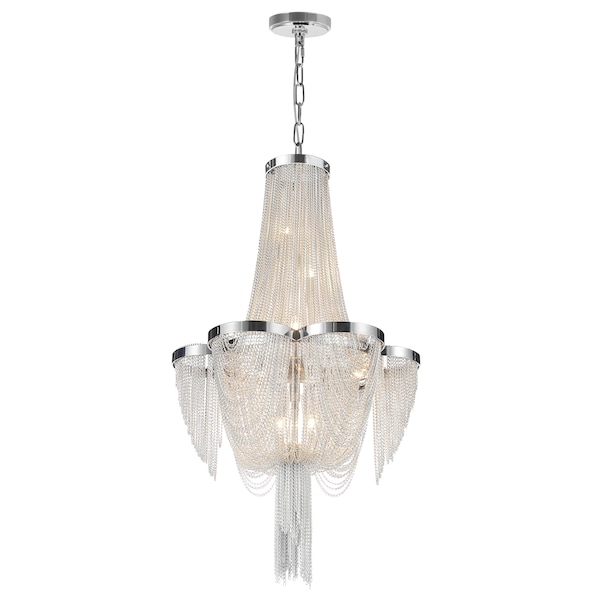 Delicate and feminine yet edgy, the Taylor 7 Light Down Chandelier will gracefully bring a luxe look to your space. This charming 14 inch wide fixture features a flower-shaped, chrome-finished metal frame that displays a sharp contrast to the soft, draping strands of jewelry chains that veil the candelabra-based bulbs. Dress up your living space the romantic way with this captivating light source.