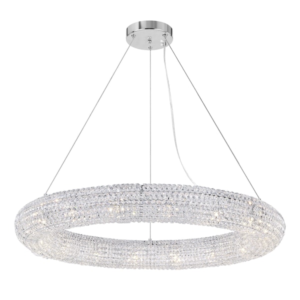 A true stunner, this crystal halo chandelier will lend a glorious glow to anywhere it is placed. The delicate and elegant Veronique 16 Light Chandelier features an oversized circular frame measuring 40 inches in diameter. The chrome frame is beautifully wrapped with glistening crystals. This bright and sparkly light fixture will look gorgeous above a dining table, on a formal sitting room, and even in your home's primary bedroom.