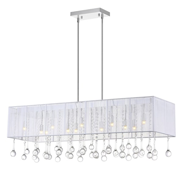 Let the Water Drop 14 Light Chandelier Clear Crystal lend a special atmosphere to your space. This glistening light fixture is designed with a 40 inch rectangular shade in white or silver. Dangling underneath are clear crystal droplets that radiate light. This is the exact finishing touch a modern but sterile space needs.