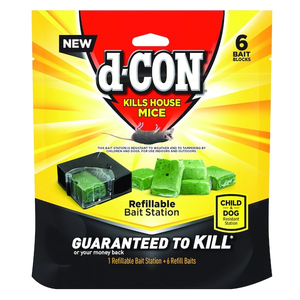 NEW from d-CON! Our new formula is made with 99% food grade ingredients. It is so d-LICIOUS that mice will risk their lives for it. The formula does not contain neurotoxins or anti-coagulants. If you have signs of mice (droppings footprints gnawing or scampering noises in your walls) you'll want to try this d-CON Refillable Bait Station. Place the station where you notice signs of mice activity. You'll be able to see the bait through the station to gauge if mice are eating it or not. Once you notice signs of mice feeding on the baits mouse activity should cease within a few days. If you don't see chew marks on the bait after a few days try moving it to another area. d-CON Disposable Corner Fit Mouse Poison Bait Stations are discreet compact & this low profile pre-baited station comes ready-to-use. There is no need to touch the bait when placing the station. This bait station is resistant to tampering by children. Mice get the bait Kids can't. Weather-resistant station can be used indoors or outdoors. Ideal for: corners attics behind appliances basements garages and sheds.
