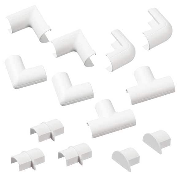 Accessory Multipack, Series D-Line Micro+ Raceway 0.78 in x 0.39 in (20x10mm) Item 60WA67, 60WA61 and 60WA62, For Raceway Height 1/2 in, For Raceway Width 3/4 in, For Raceway Width x Height 13/16 in x 3/8 in, Material PVC, Color White, Number of Channels 1, Mounting Style Clip-Over, Backing Open, Compatible with Product Type Micro+ Raceways, Features Clip Over, Includes (2) 90 Degree External Elbow, (2) 90 Degree Flat Elbow, (2) 90 Degree Internal Elbow, (2) End Cap, (2) Tees, (3) Coupling