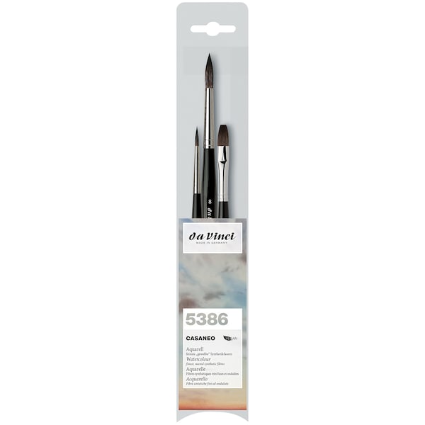 CASANEO is a new ''wavy'' fiber synthetic developed by da Vinci for water media artists. Manufactured from extra smooth, slightly wavy synthetic fibers, CASANEO replicates the feel of natural squirrel hair but comes to a better point. This special construction allows the fibers to absorb a huge amount of water & color delivering an endless brush stroke. Ideal for watercolor, gouache, fluid acrylics & ink painting. These brushes feature short, hexagonal handles. Made in Germany. 100% Vegan. Handles are from sustainable forests in the Baltic states. Eco friendly manufacturing. This set includes 3 brushes: Series 5598 Size 4 and 8 as well as Series 5898 Size 8.