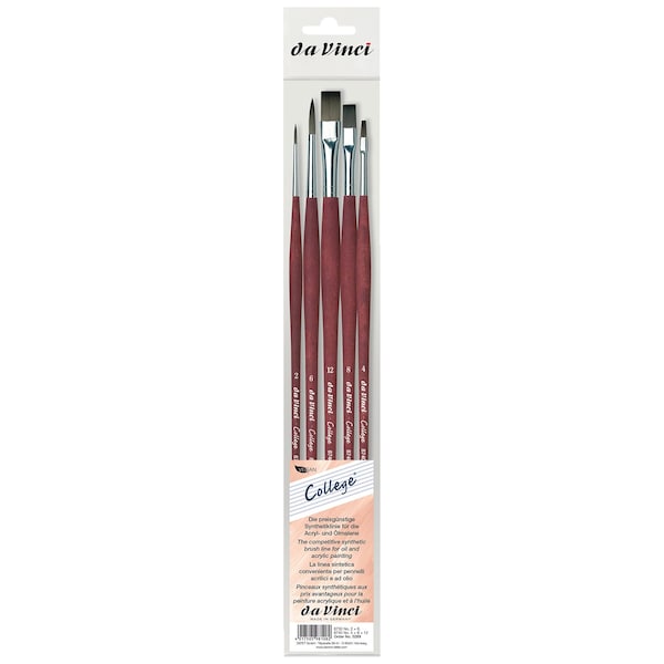 COLLEGE is da Vinci's most economical synthetic for acrylic & oil. It features a strong, elastic synthetic fiber that is easy to clean. COLLEGE has a new water-based matte lacquered handle & a seamless ferrule, rare in student brushes. COLLEGE is a higher quality, well-built brush for beginners & students. The long handles feature a non-slip surface. Certified green manufacturing with sustainable wood handles handmade in Germany at our family-owned factory since 1890. 100% Vegan. This set includes Series 8730 (Round) Sizes 2, 6 and Series 8740 (Flat) Sizes 4, 8 and 12.