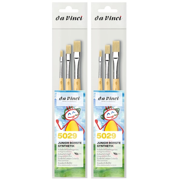 da Vinci Junior art brushes are a well built, easy to use brush developed to improve the quality of brushes for beginners. They can be used with any type of paint and are easy to clean. The ''hold it like a pencil'' handle shape makes for a comfortable and familiar grip. The brush won't roll away if dropped. It has a reinforced brush head for heavy wear that will always hold its edge. Unlike most cheaper brushes, da Vinci junior features a ''rust resistant'' seamless polished ferrule. Made in Germany. Sustainable wood handles. Vegan. Eco-Friendly. Each set includes 3 brushes: Series 329 Size 4, 8 and 12. Sold as 2 sets for a total of 6 brushes.