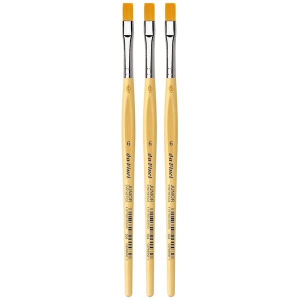 da Vinci Junior art brushes are a well built, easy to use brush developed to improve the quality of brushes for beginners. They can be used with any type of paint and are easy to clean. The ''hold it like a pencil'' handle shape makes for a comfortable and familiar grip. The brush won't roll away if dropped. It has a reinforced brush head for heavy wear that will always hold its edge. Unlike most cheaper brushes, da Vinci junior features a ''rust resistant'' seamless polished ferrule. Made in Germany. Sustainable wood handles. Vegan. Eco-Friendly. Sold as a pack of 3.