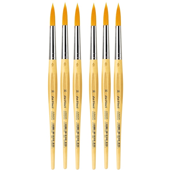 da Vinci Junior art brushes are a well built, easy to use brush developed to improve the quality of brushes for beginners. They can be used with any type of paint and are easy to clean. The ''hold it like a pencil'' handle shape makes for a comfortable and familiar grip. The brush won't roll away if dropped. It has a reinforced brush head for heavy wear that will always hold its edge. Unlike most cheaper brushes, da Vinci junior features a ''rust resistant'' seamless polished ferrule. Made in Germany. Sustainable wood handles. Vegan. Eco-Friendly. Sold as a pack of 6.