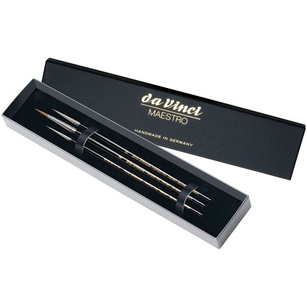This 3-brush set is the perfect gift for watercolorists. Series 10 has European style shaping with an extra-sharp point and the fastest action at the tip. The high-quality, extra-elastic Kolinsky Red Sable brushes provide high color absorption, making it easy to paint all details perfectly. All brushes are handmade from raw material to finished brush by skilled artisans at the factory. Hair is deeply set in in brass ferrule so brush will keep its shape. The nickel-plated brass ferrule is rust-resistant. Certified green manufacturing with sustainable wood handles made in Germany at our family-owned factory since 1890. This set includes Series 10 (Round) in Size -5, 0 and 4 in an elegant black gift box.