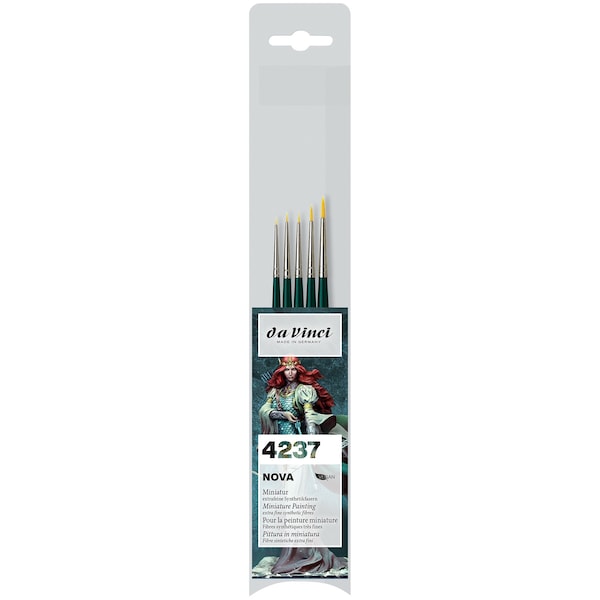NOVA golden synthetic brushes for all paints & painting techniques - in many different shapes. This line has been one of our best-sellers for decades. Our well-known mix of synthetic fibers of 3 different diameters with a high color absorbing capacity for smooth and even strokes. Certified green manufacturing with sustainable wood handles handmade in Germany at our family-owned factory since 1890. 100% Vegan. This set contains: Series 1570 Size -10, -5, -3, 0 and 2.