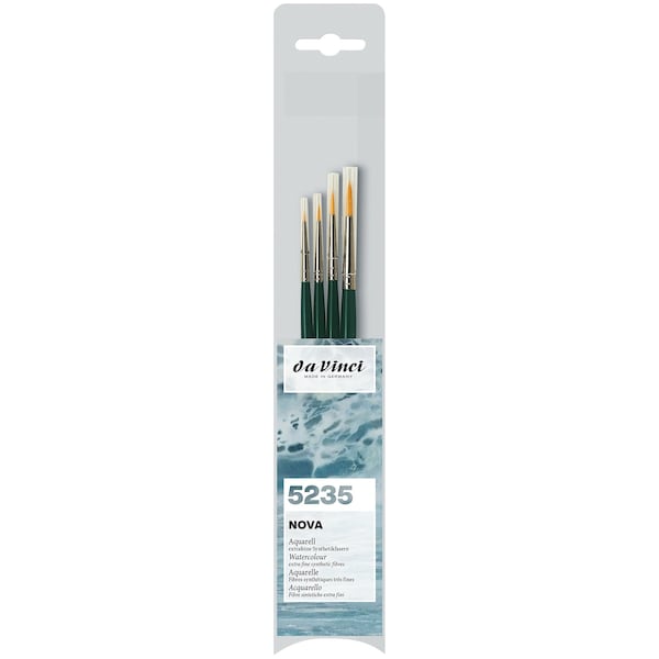 NOVA golden synthetic brushes for all paints & painting techniques - in many different shapes. This line has been one of our best-sellers for decades. Our well-known mix of synthetic fibers of 3 different diameters with a high color absorbing capacity for smooth and even strokes. Certified green manufacturing with sustainable wood handles handmade in Germany at our family-owned factory since 1890. 100% Vegan. This set contains: Series 1570 Size -3, 0, 2 and 4.