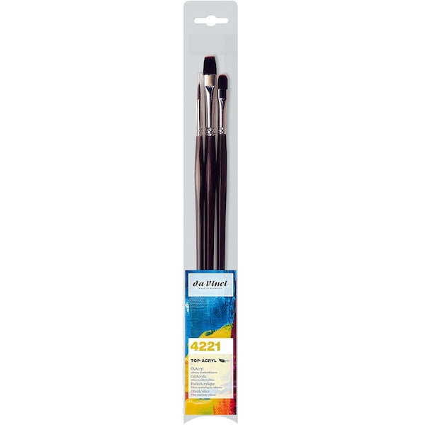 Extra strong and stiff for acrylics, oils & water-mixable oils TOP-ACRYL is constructed with 5 different diameters of extra strong Synthetic Bristle. Long handles fit right in your painting box or travel easel. Exclusive design developed by da Vinci. Extra stiff with a precise snap, and a favorite of Impasto painters (who use thick applications of paint). Whether massing color in the larger sizes or precision painting in the smaller sizes, TOP-ACRYL brushes offer the artist versatility and ruggedness. The brush features a long, lacquered hexagonal handle. This set includes: Series 7185 Size 12, Series 7485 Size 8 and Series 7785 Size 4.