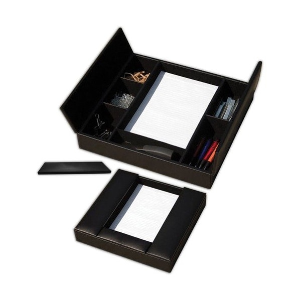 Conference room organizer with six compartments features an open center section that holds legal-size or letter-size papers to provide easy access to a fresh sheet of paper, writing pad and more. Lids on each side of the organizer conceal the office supply compartments to protect your supplies from dust and debris. Top-grain leather material is incredibly strong and offers a luxurious look that's perfect for any professional environment. Its smooth velveteen lining on the interior and bottom offers excellent protection where you need it most.