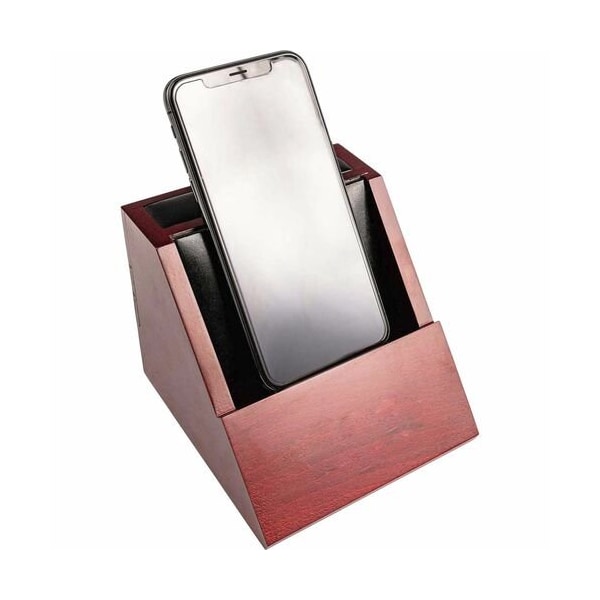 Desktop Cell Phone Holder features an open-front design to provide enough room to hold a smartphone with a protective cover. Bottom opening provides enough clearance to connect a cell phone charger. Wooden construction and leather accents add professional style to any work space. Rubberized, foam dots protect surfaces from damage.