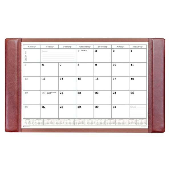 Keep yourself organized with this black leather desk pad that includes a monthly calendar insert. The desk calendar insert pack comes complete with 12 individual sheets for each month with all major holidays labeled. The desk pad holds all 12 sheets so changing months is as easy as pulling out the top sheet.