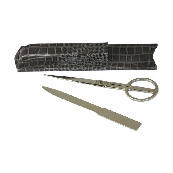Library Set features a stunning combination of Italian leather and handcrafted design to make it a showpiece that you'll be proud to feature prominently on your desk. Silver-accented scissors and a letter opener neatly stowed in a gorgeous leather holder unit, this essential accessory adds both function and beauty. Solid and hefty, the quality of the materials and construction are readily apparent. The unique, high-end style of this Italian leather piece will make a statement of luxury in your office from day one. The leather adds a smart, sophisticated look to your space. Letter opener has a 5'' blade. Scissors have 4'' blades. Soft velveteen protects surfaces from scuffs and scratches.