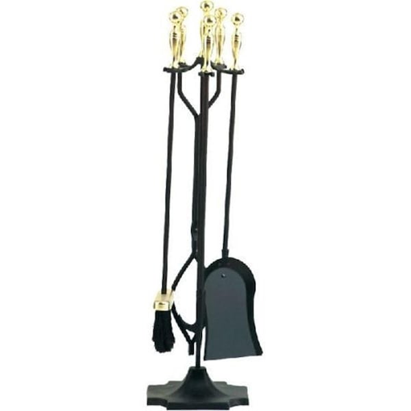 Fireplace Tool Set - Rail on Base, Black & Polished Brass - 5 Piece