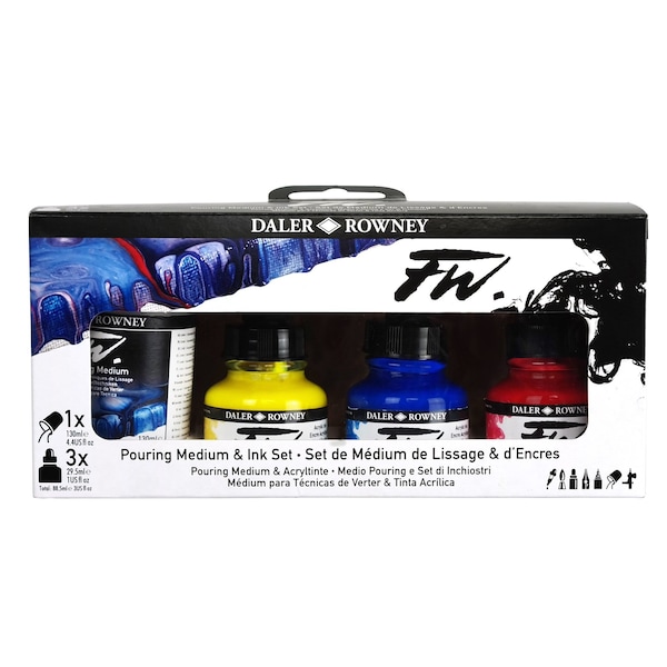 Since 1783, Daler-Rowney has inspired professional artists, art students and hobbyists to embrace their creativity. Whether you're a professional artist, a beginner working on your techniques, or somewhere in between, this acrylic ink set includes three 29.5ml bottles of ink in 3 striking colors to help you express your creative vision, plus a bottle of pouring medium. Made with superior pigments, this FW ink set contains incredibly lightfast, richly hued ink with marvelous fluidity and is a great alternative to alcohol or India inks. All ink colors in this artist set are fully intermixable and can be used directly from the bottle or thinned with water to create amazing effects. Explore the exciting world of art ink pouring with the added acrylic pouring medium which is suitable for techniques such as dirty pour, swirl, puddle pour, flip cup, and swipe. Ideal for fine artists, illustrators, graphic designers, calligraphers, decorative artists and hobbyists, these inks make a great addition to calligraphy kits, any drawing set, airbrush kits, or can be used as watercolor liquid and more. If you're looking for an affordable professional-grade ink set in a wide variety of colors, look no further. Daler Rowney acrylic ink makes quality and performance more accessible than ever.