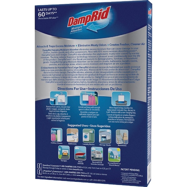 The Hanging Moisture Absorber is designed to hang in closets and small enclosed spaces to protect items and fabrics from excess moisture that causes damage and spotting. DampRid hanging moisture absorber with activated charcoal not only prevents mold and mildew stains and musty odors by eliminating excess moisture but also absorbs and removes odors from the toughest sources such as cooking garbage bathrooms and diaper pails creating fresher cleaner odor-free indoor air. It can be used in any room closet storage area or locker. It lasts up to 60 days depending on temperature and conditions. So effective its patented. Suggested uses: Bathrooms bedrooms kitchens clothes closets laundry rooms storage closets and more. Non-toxic septic safe and friendly to the environment. Inhibits Mold & Mildew.