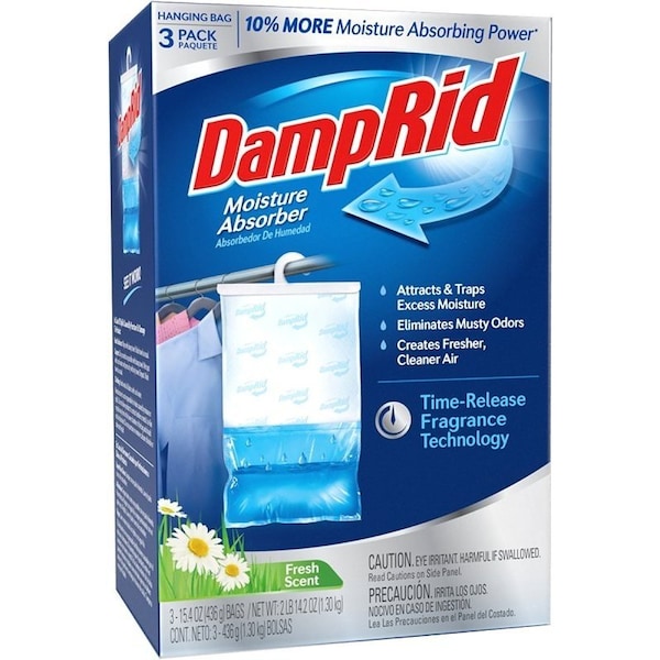 DampRid Hanging Moisture Absorber, Net Content: 15.4 oz, Box, Solid, Odor/Scent: Fresh, Odorless, Off-White, Compositions: Calcium Chloride, Sodium Chloride, Potassium Chloride, Specific Gravity: 2.15, Melting Point: 369 to 1420 deg F, Boiling Point: 350 to 3500 deg F, Density: 15.4 lb/gal