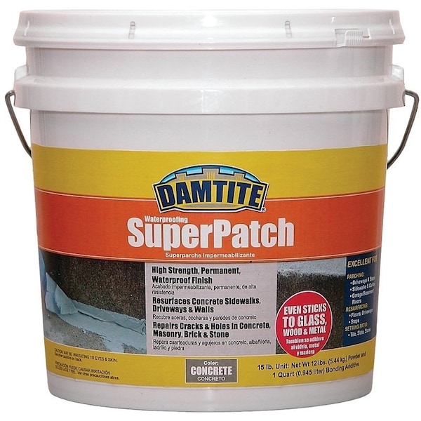 SuperPatch is a two-component, multi-purpose, waterproofing mortar for patching, repairing or resurfacing concrete, masonry, stucco and brick, up to 1 in thickness in one application. Exact amount of powder and liquid are included in this container. Just mix the powder with liquid together in a clean container. SuperPatch is a non-shrink, unique formula with exceptional strength and adhesion for use on worn surfaces. It evens sticks to glass, steel, aluminum and wood, so is ideal for areas abutting these materials. Can be feather edged or applied up to 3 in thickness, using multiple layers. Ideal to anchor bolts, railings and other fixtures into concrete or to build-up worn or broken step corners without using forms. Use for vertical or horizontal, above or below grade patch and repair projects both inside and out. Will not cause acidic reaction with aluminum.