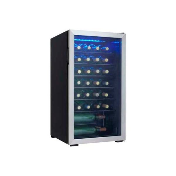 Danby - dwc036a1bssdb-6 features: 36-bottle free-standing wine cooler. Temperature range of 6degrees c - 14degrees c (43degrees f - 57degrees f). Blue led interior lighting beautifully showcase the wine without the heat of an incandescent bulb. Recessed pocket style handle. Black wire shelving. The tempered glass door helps to protect the wine from harmful uv rays. Smooth back design. Convenient reversible door swing for left or right hand opening.