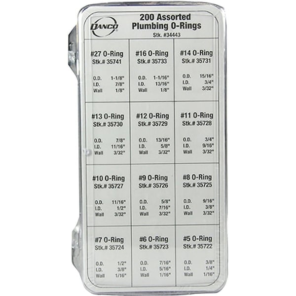 Replacement O-rings to help repair leaky faucets. Replacing the seals on the faucet stem will create a better seal and help prevent water leaks. Faucets usually have one or more O-rings that prevent water from leaking out around the spout. Replacing O-rings is an inexpensive alternative to replacing the entire faucet. Save water and energy by stopping the leak. Kit contains 200 of the most commonly used O-rings. Includes: 1-1/8-inch 1-1/16-inch 15/16-inch 7/8-inch 13/16-inch 3/4-inch 11/16-inch 5/8-inch 9/16-inch 1/2-inch 7/16-inch and 3/8-inch outside diameter O-rings.