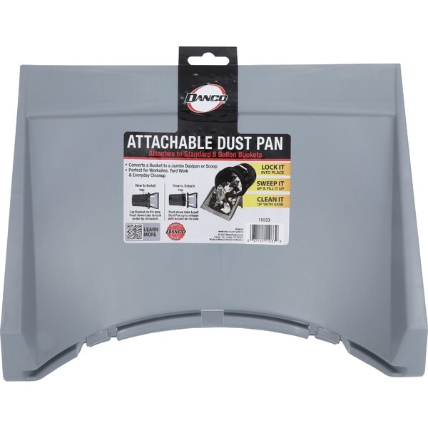 Transform your ordinary 5 Gal. bucket into a multi-use tool that will help you with your everyday household and PRO projects. The Danco Attachable Dust Pan quickly latches onto your 5 Gal. bucket rim for fast and easy clean up. This bucket accessory stays secure during your projects with our specially designed clips and solid wedge for added support. All you need to do is latch and lock the dustpan into place flip onto its side and start sweeping dirt trash leaves standing water and so much more into your 5 Gal. bucket then toss into a larger trashcan. Uses: Sweep up outdoor debris collect trash pick up items in home such as small toys or pet hair shovel up snow/ice or overflow of water caused by a flood even use it to remove excess paint from a paint roller or brush. The Attachable Dust Pan converts your bucket to a jumbo dustpan and is perfect for construction and job worksites warehouse yard work and everyday home cleanup.