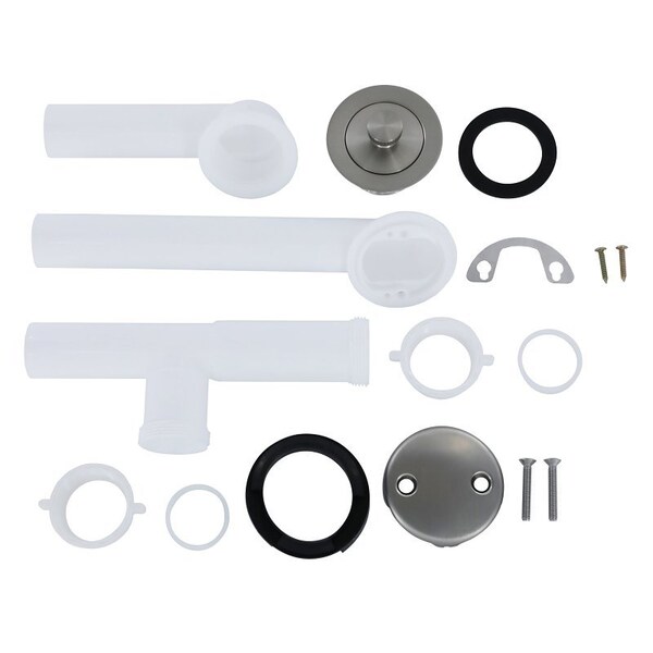 The Danco brushed nickel tub drain kit is a complete bath drain kit for most standard tubs. It features 1-1/2 in plastic tubing that provides durability for a long product life. The kit includes all of the necessary parts to replace an existing drain or add a new tub. The drain trim has a twist and turn style with a polished brushed nickel finish that will match existing faucet finishes.