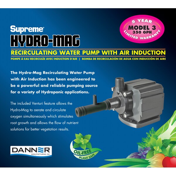 Pondmaster 350 GPH Hydro-Mag Pumps are designed with energy-efficient Oil free, Magnetic Drive Technology. This pump is perfect for small Hydro systems. Can be operated in-line or submersed. Includes an adjustable Venturi for added aeration. Includes 1/2" female barbed fitting. 10' power cord.