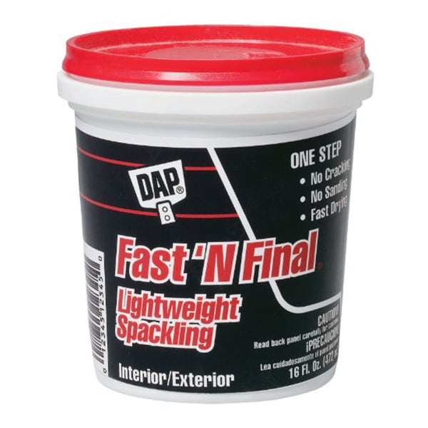 DAP Fast 'N Final Lightweight Spackling lets you patch and prime in one easy step, saving time and money. It dries fast with no need to sand or prime, letting you paint in minutes for a virtually invisible repair. Ideal for repairing holes, cracks and dents in drywall, plaster, wood and stucco. Interior/exterior use.