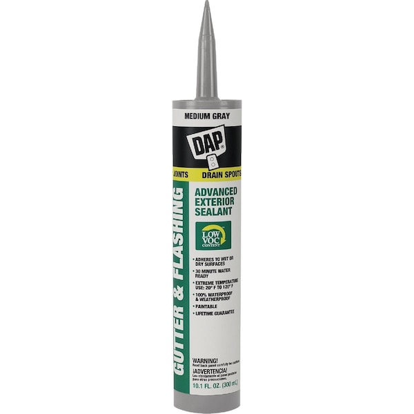 DAP Gutter & Flashing Low VOC advanced polymer formula sealant delivers excellent performance on aluminum steel galvanized bonderized surfaces PVC concrete wood painted surfaces and many other common building substrates. It forms a flexible watertight and weatherproof seal that withstands up to +/-25% total joint movement. It offers wet weather and low temperature application. It is paintable and has virtually no VOCs (less than 1%). 100% water and weatherproof. Low odor. Interior/exterior use. Meets ASTM Specification C 920 Type S Grade NS Class 25 Use NT A G M and O. Suggested Uses: Ideal for Sealing: Gutters Drain Spouts Flashings Ducts/Vents Corner & Butt Joints Corrugated Roofing Aluminum Siding.