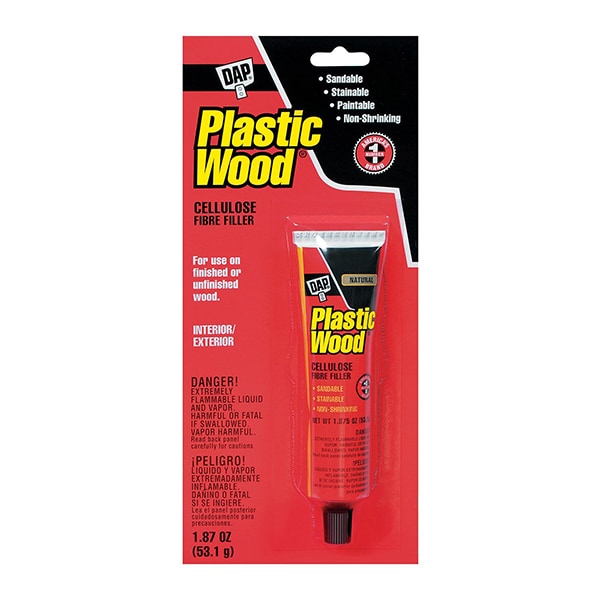A high-performance, solvent-based wood filler that hardens to give a repair that is 3X stronger than the wood itself. This pro-grade, heavy duty wood filler contains real wood fibers so it looks and acts like real wood. It can be sanded, cut, drilled, screwed, planed, stained, varnished, painted, or lacquered. It provides strong nail and screw anchoring without splitting. DAP Plastic Wood Professional Wood Filler dries fast, hard, and is shrink and crack resistant. For interior / exterior use.